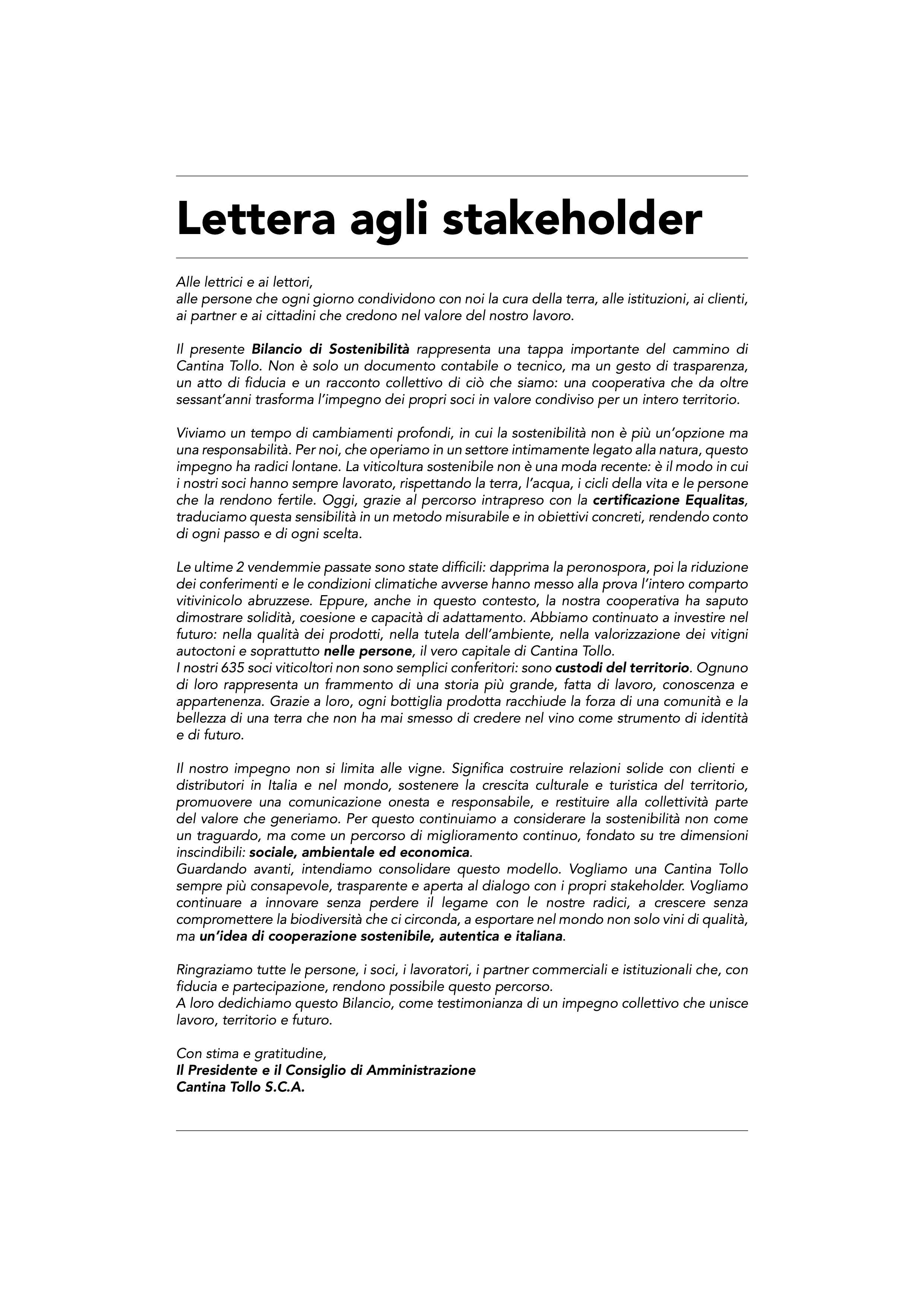 Il Bilancio di Sostenibilità 2024/2025 di Cantina Tollo evidenzia l'impegno verso la sostenibilità ambientale, sociale ed economica, consolidato dalla certificazione Equalitas. La cooperativa, fondata nel 1960, valorizza il territorio abruzzese e i vitigni autoctoni, adottando pratiche responsabili in vigneto e cantina. Il bilancio sottolinea risultati come la riduzione dell'impatto ambientale, la gestione efficiente delle risorse e l'attenzione al benessere della comunità, confermando Cantina Tollo come leader sostenibile nel settore vitivinicolo italiano.